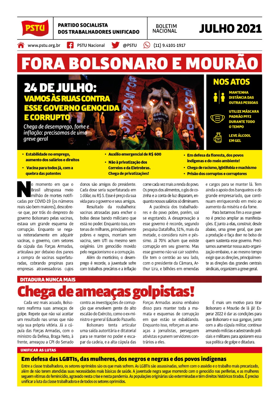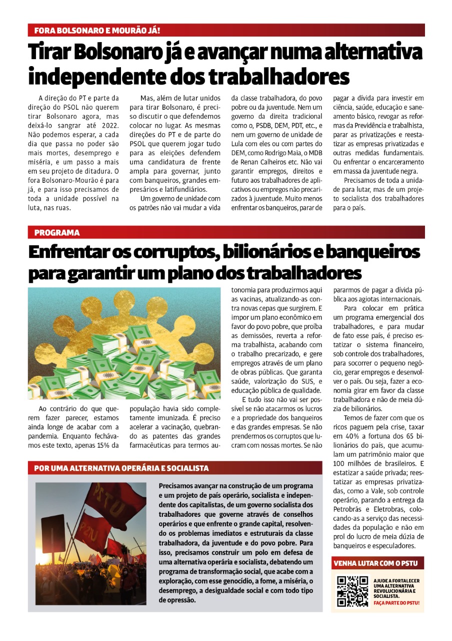 Ao contrário do que querem fazer parecer, estamos ainda longe de acabar com a pandemia. Enquanto fechávamos este texto, apenas 15% da população havia sido completamente imunizada. É preciso acelerar a vacinação, quebrando as patentes das grandes farmacêuticas para termos autonomia para produzirmos aqui as vacinas, atualizando-as contra novas cepas que surgirem. E impor um plano econômico em favor do povo pobre, que proíba as demissões, reverta a reforma trabalhista, acabando com o trabalho precarizado, e gere empregos através de um plano de obras públicas. Que garanta saúde, valorização do SUS, e educação pública de qualidade.