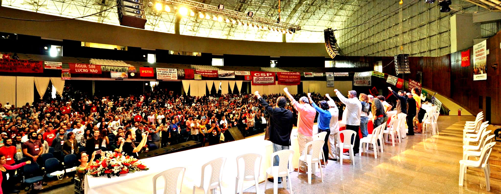 “Buscamos aqui honrar os lutadores e lutadoras da nossa classe, como Dandara, os três companheiros mortos de Belo Monte, honrar a greve educadora que varre de norte a sul desse país“, afirmou na abertura Atnágoras Lopes, que falou em nome da Secretaria Nacional Executiva da CSP-Conlutas. Ele saudou em especial a “juventude operária que faz a sua experiência e rompe com o governo“.