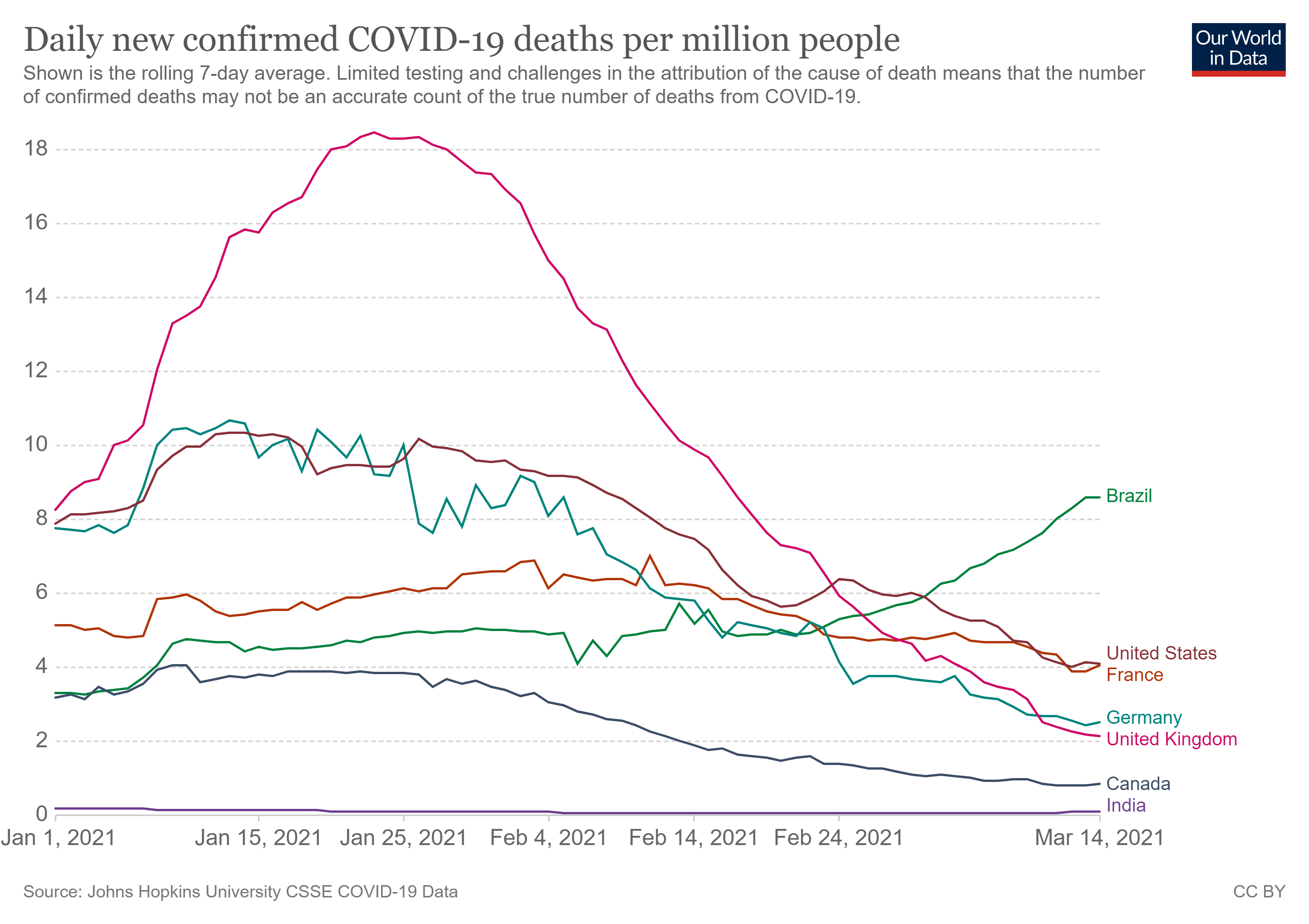 No dia 16 de março o site Our World in Data, ligado à Oxford, contabilizava 2,6 milhões de óbitos por COVID-19 no mundo. Os EUA lideravam em números absolutos com 535 mil mortes, seguido pelo Brasil, com 279 mil.