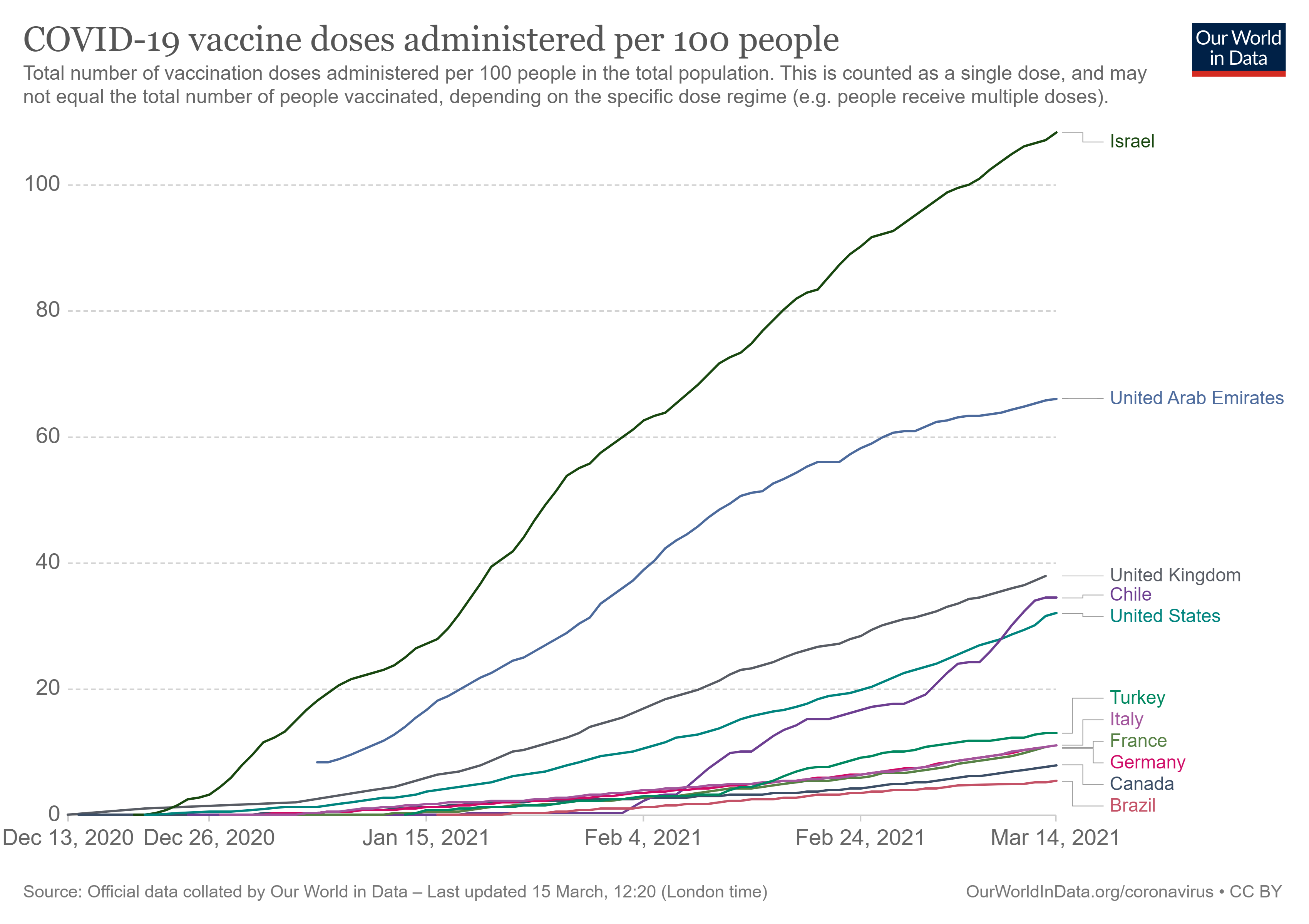 Em termos de percentagem de vacinados em relação à população, o Brasil figurava em décimo lugar, segundo dados do Our World in Data computados até o dia 14 de março. Atrás de Israel, Emirados Árabes, Chile, Bahrein, Estados Unidos, Sérvia, Turquia, Itália e Canadá. Com a diferença de que, ao contrário desses países, o Brasil é hoje o epicentro da pandemia, com o maior registro de mortes diárias no planeta.