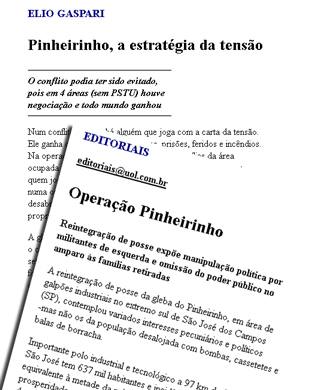Argumento semelhante foi utilizado pelo colunista Elio Gaspari no dia anterior. No artigo Pinheirinho a estratégida da tensão, o articulista acusa uma suposta intransigência do movimento dos moradores do Pinheirinho em negociar a compra do terreno com os proprietários. Editorial do Estado de S. Paulo, o segundo maior jornal do estado, também acusa o PSTU de forma semelhante. Segundo o jornal, o PSTU que prega a substituição do Estado capitalista pelo ” marxismo revolucionário” (sic) apostaria no confronto com a polícia como forma de obter vantagem política.
