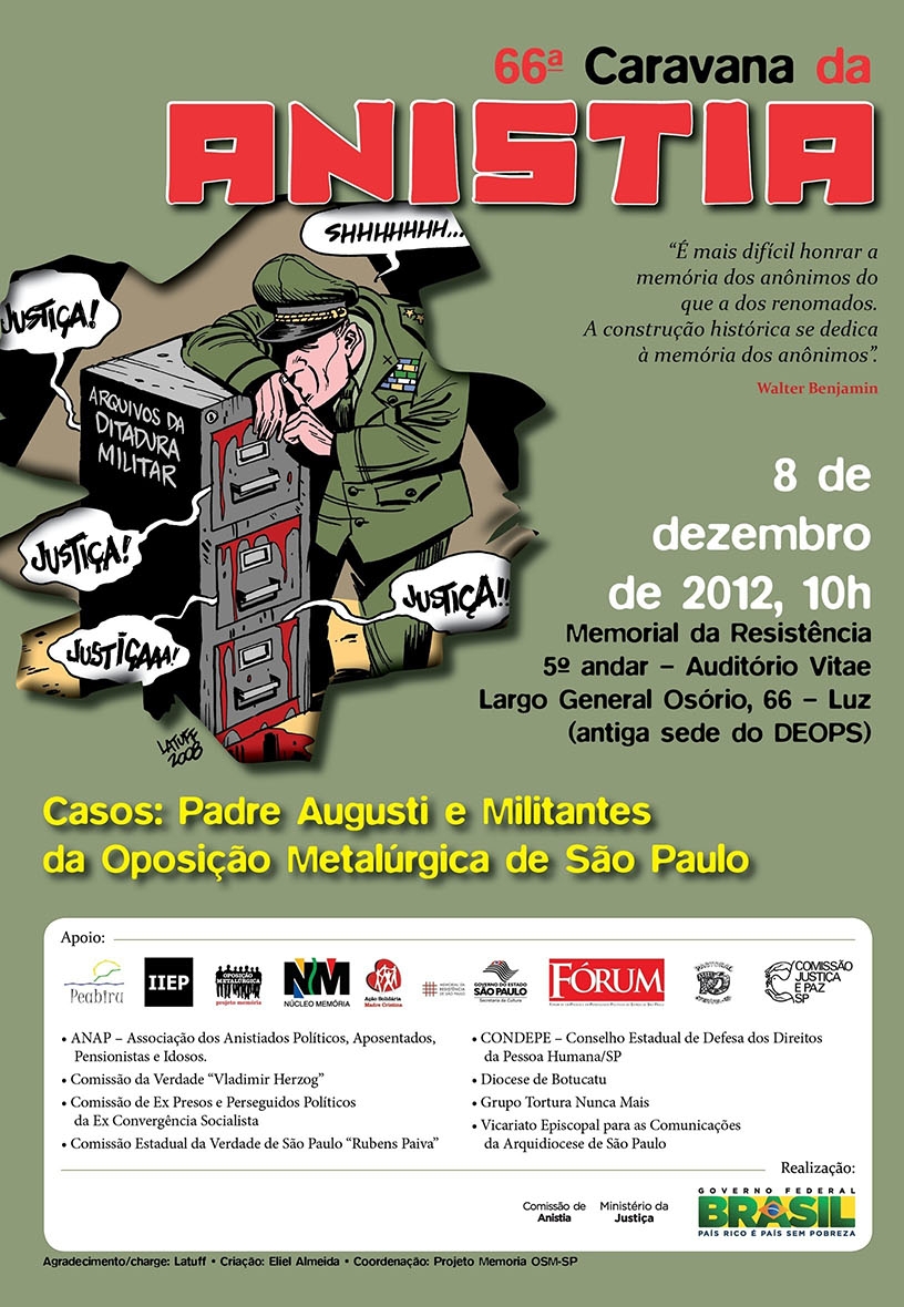 O julgamento será na 66° Caravana da Anistia no dia 8 de dezembro, sábado, às 10h, no Memorial da Resistência, 5ª andar – Auditório Vitae. (Largo General Osório, 66 – Luz – antiga sede do DEOPS).
