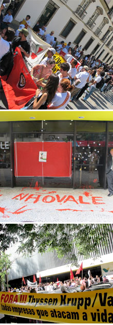 Com bandeiras, faixas e palavras de ordem, eles exigiram a soberania dos povos e denunciaram os ataques da empresa aos trabalhadores. “Brasil, Canadá, América Central, a luta contra a Vale é internacional”, cantaram em frente à sede da Vale, no Centro do Rio de Janeiro.