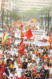 O ato foi bem diferente das duas últimas manifestações na Grande São Paulo, uma organizada por CUT e UNE a favor do governo e outra pela Força Sindical e partidos de direita. Ao contrário de burocratas e políticos picaretas, a marcha da Conlutas teve a participação massiva de trabalhadores, e foi numericamente superior. Estudantes universitários que, na noite anterior, enfrentaram a bárbara repressão da polícia do governador Geraldo Alckmin, denunciavam Lula e a política neoliberal do PSDB no estado. “É Lula lá, Geraldo aqui. E a nossa verba vai pro FMI”, cantavam.