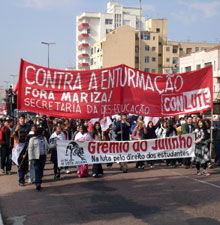 Mas o ato também atacou Lula e as reformas neoliberais, pois, se é verdade que o governo do PSDB ataca a educação pública, também é verdade que o governo federal, do PT, é o principal responsável pela situação precária da educação no Brasil, pois investe apenas 3,5% do Produto Interno Bruto (PIB) em educação – metade dos miseráveis 7% previstos como meta no Plano Nacional de Educação (PNE).