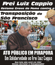 Nesta sexta-feira, 7, acontece em Pirapora (MG) o Ato Público em Solidariedade ao frei Luiz Cappio e pela suspensão defintiva da transposição do rio São Francisco. A partir das 8h, os participantes devem se reunir na Praça da Matriz. A atividade é convocada pelo Comitê de Luta em Defesa do Rio São Francisco, composto por Conlutas, PSTU, Movimento dos Trabalhadores Sem-Terra (MST), Central de Movimentos Populares, Graal, sindicatos de metalúrgicos de Pirapora e Várzea da Palma, estudantes da Unimontes, estudantes secundaristas e Colônia Z-20 de Ibiaí.