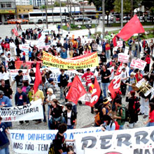 Por volta das 13h, depois de percorrer as principais avenidas do Centro, a passeata se dirigiu até o Palácio do Iguaçu, sede do governo estadual. Para surpresa de todos, o governador Roberto Requião (PMDB) estava fazendo um discurso para membros da Federacao dos Trabalhadores da Agricultura, entidade ligada a CUT e CONTAG. O ato da conlutas seguiu até a frente do Palácio, interrompendo o discurso de Requião. Antes de fugir para seu gabinete, o governador, da base de apoio de Lula, fez uma fala tentando criar um confronto entre os trabalhadores e os estudantes.