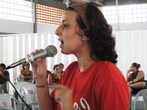 A assembleia contou com a participação de representantes da Conlutas, Intersindical, CUT e CTB. A Conlutas foi representada pela companheira Ana Pagamunici, da Secretaria Executiva Nacional (foto). Única mulher presente na mesa, a companheira começou sua fala saudando as mulheres, em uma categoria predominantemente feminina, mas dirigida por homens.