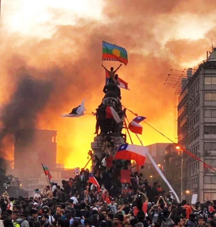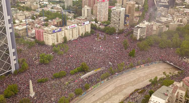 A manifestação em Santiago é gigantesca. A Plaza Itália e toda a Alameda são completamente ocupadas. A manifestação chega até os bairros de classe média alta, onde milhares de manifestantes começam a descer dos edifícios e somar-se à história. Em frente à Biblioteca Nacional um grande show é realizado. A histórica canção El Derecho de Vivir en Paz, de Victor Jara, conhecido cantor e compositor assassinado pela ditadura de Pinochet, é escutada a muitas quadras de distância. As fotos dessa enorme manifestação circulam por todo o planeta. Uma das fotos mais emblemáticas mostra a estátua do general Baquedano, considerado um dos principais responsáveis pela vitória chilena na guerra do Pacífico, contra Perú e Bolívia, totalmente ocupada por manifestantes. Em cima da estátua e com muitas bandeiras chilenas ao redor, um manifestante hasteia a bandeira mapuche. A história também é feita de simbolismos.