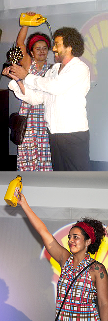 Homenageados criticaram patrocínio da petroleira e atriz jogou óleo queimado no palco, simulando petróleoMerece todo o nosso apoio a atitude corajosa do Coletivo Dolores Boca Aberta Mecatrônica de Artes, um dos grupos teatrais de São Paulo, durante a 23ª. cerimônia de entrega do Prêmio Shell de Teatro. Na hora de receber o troféu, dois atores do grupo fizeram uma pequena encenação em protesto contra a empresa. A atriz Nica Maria jogou óleo queimado, simulando petróleo, sobre a cabeça do ator Tita Reis, que em seu discurso ironizou o patrocínio da Shell. “Nosso coração artista palpita com mais força do que qualquer golpe de estado patrocinado por empresas petroleiras”, disse o ator. Foi uma enorme surpresa para o público e para os patrocinadores, que nunca esperavam tamanha ousadia por parte de um grupo selecionado para receber o prêmio.