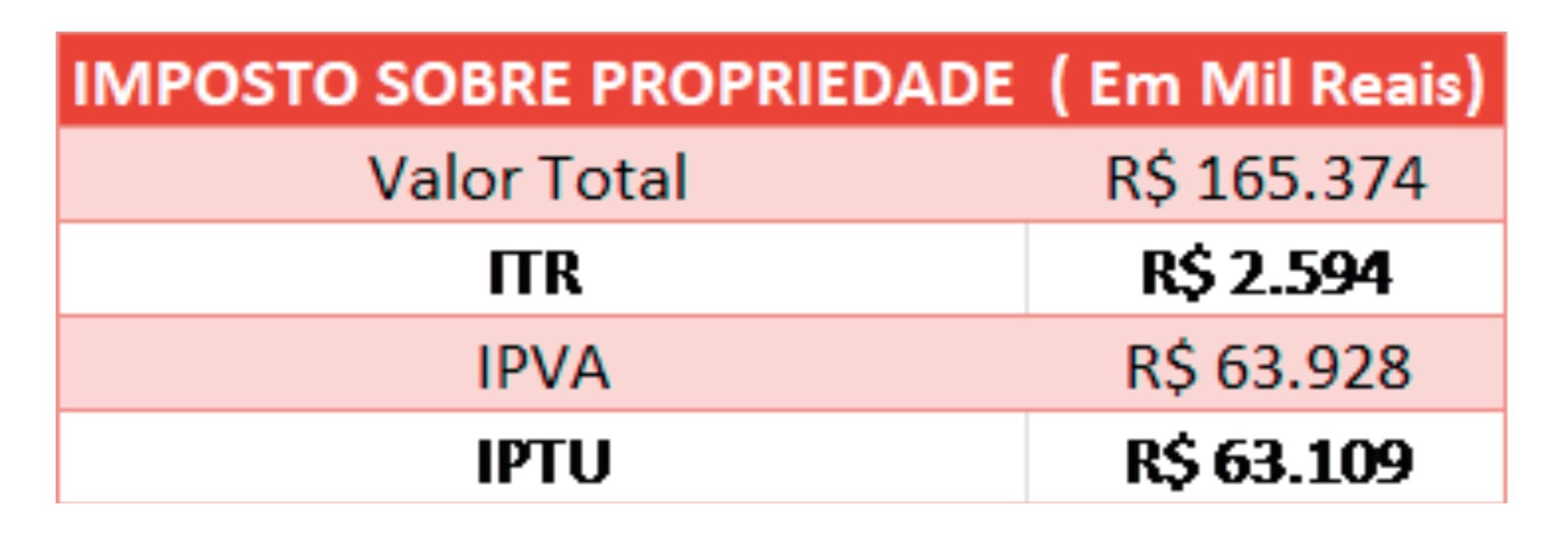 Dos R$ 165,37 bilhões arrecadados com impostos sobre a propriedade, destaca-se o IPVA, que é o imposto que todos pagamos quando possuímos um veículo automotor que, juntamente com o IPTU, tem os trabalhadores como principais contribuintes. Enquanto isso, o Imposto Territorial Rural é de apenas R$ 2,5 bilhões. Dá para ver que a grande propriedade no Brasil praticamente não paga impostos, que recaem, mais uma vez, sobre a classe trabalhadora e não sobre os ricos.