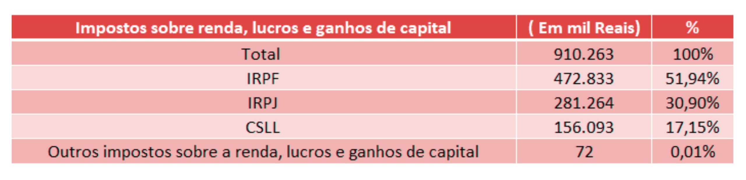 No que se refere aos impostos sobre a renda, dos R$ 910,26 bilhões arrecadados, cerca de R$ 472,83 bilhões (ou seja, 51,94%) são pagos pelos trabalhadores, com o Imposto de Renda de Pessoa Física. Enquanto a Contribuição Social sobre o Lucro Líquido (CSLL), paga pelas empresas, contribui com apenas R$ 156,09 bilhões e representa 17,15% dos impostos sobre a renda e lucros. Junto com o IRPJ são um dos poucos impostos que os empresários pagam e, mesmo assim, pagam menos que os trabalhadores. Ao mesmo tempo, outros impostos, incluindo sobre os ganhos de capital, são praticamente inexistentes, contribuindo com 0,01% dos impostos sobre a renda e lucros.