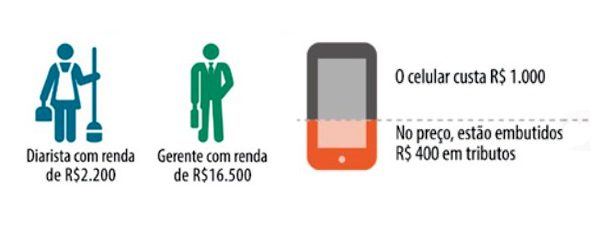 Quando uma diarista ou um gerente compram um celular, por exemplo, eles pagam algo como R$ 400 só em impostos. O que é importante destacar é que este pagamento é considerado “regressivo”, pois a diarista, que ganha menos, paga mais, proporcionalmente à sua renda, do que é pago pelo gerente.