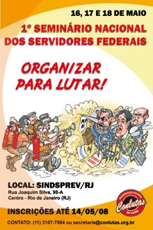 A Conlutas realizará nos dias 16, 17 e 18 de maio, no Rio de Janeiro, o Seminário Nacional dos Servidores Públicos Federais. Com o lema “Organizar para Lutar”, o seminário será um espaço de discussão para os próximos passos da organização dos servidores que hoje estão na Conlutas.