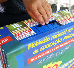 Neste momento, além da divulgação da consulta eletrônica, deve ser tratada como prioridade pelas entidades a coleta de votos desse plebiscito. Nessas duas semanas é importante dar o gás necessário, montar as urnas e prosseguir com coleta em escolas, portas de fábricas, terminais de ônibus e metrô, feiras e outros lugares nos quais existam fluxo de pessoas. Outra orientação importante é de que nas escolas ou universidades que estão parcialmente em férias, a coleta deve ser complementada em locais públicos.