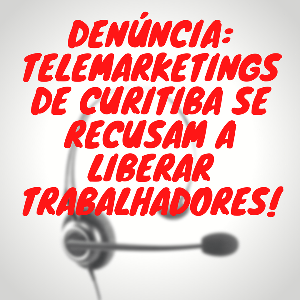 Desobedecendo todas as orientações para a contenção da epidemia do Covid-19, todos os centros de telemarketing de Curitiba seguem funcionando normalmente, em condições que já seriam consideradas insalubres mesmo fora de uma epidemia. São milhares de trabalhadores que diariamente passam horas em ambiente propício à transmissão do vírus. Apenas uma dessas empresas emprega mais de 8 mil atendentes. O risco que estes correm é altíssimo, e se estende aos seus familiares e a toda cidade.