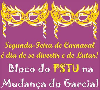 O PSTU se soma a esta luta contra a privatizaçao da cidade e, na Mudança do Garcia, vamos resgatar o verdadeiro espirito do carnaval, como uma manisfestaçao da cultura popular, marcada pela irreverência e pela crítica social e política. Estaremos na segunda-feira de carnaval nos divertindo, brincando e pulando, mas sem esquecer a nossa luta por uma sociedade mais justa, igualitária e livre da ganância e da exploração capitalista.