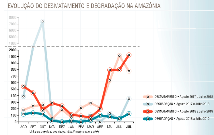 O Instituto do Homem e do Meio Ambiente da Amazônia (Imazon) constatou entre agosto de 2018 e julho de 2019 um crescimento exponencial do desmatamento na região amazônica (veja a linha vermelha no gráfico a seguir), período que coincide com a ascensão de Bolsonaro na corrida presidencial do ano passado, sua eleição e os sete primeiros meses de governo.