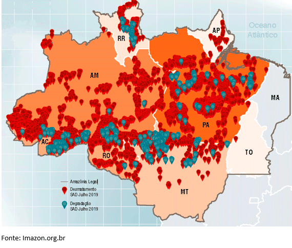 Diante das imagens de satélite, o Imazon colocou os dados no mapa, gerando a figura a seguir, que demonstra os pontos de desmatamento e degradação na Amazônia em Julho de 2019. É assustador. Muitos dirão que queimada e desmatamento não são novidade na região. É verdade, mas o grau que se intensificou nos últimos meses deve despertar nossa indignação e reação.