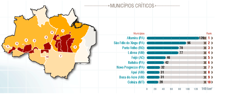 O mesmo Imazon levantou os municípios com maior quantidade de áreas desmatadas. Ao identificar esses municípios no mapa da região, fica clara a dinâmica de expansão do latifúndio e agronegócio sobre a floresta. O desmatamento parte das áreas já consolidadas com essas atividades (Mato Grosso, Rondônia, Tocantins, Sul do Maranhão e Sudeste do Pará) e se intensifica na área de expansão (em destaque na figura a seguir).