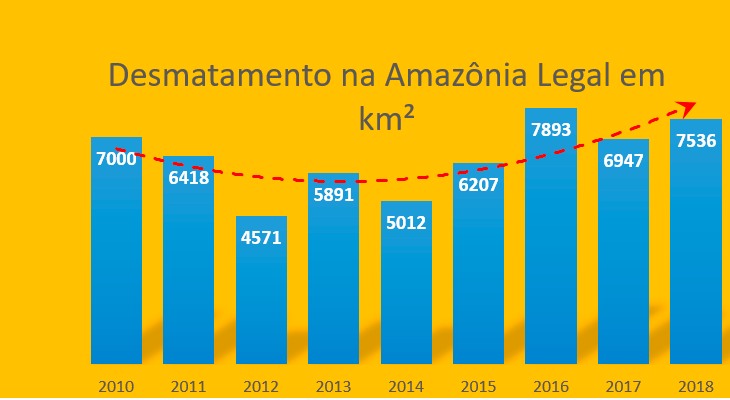 Recorrendo aos dados mais recentes, o Prodes/INPE, tal qual o Imazon, constata uma retomada do crescimento do desmatamento, desde 2013-2014, momento de intensificação da crise política no Brasil, cujo desfecho recente foi a posse de Bolsonaro. A linha de tendência do mapa comprova essa afirmação.