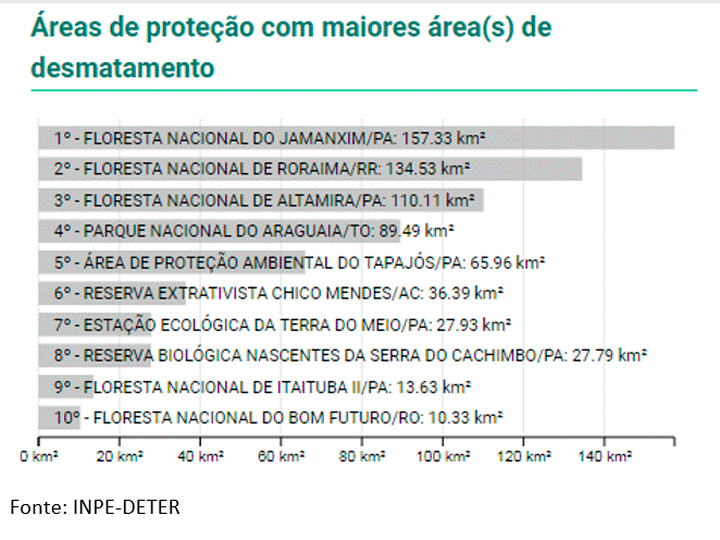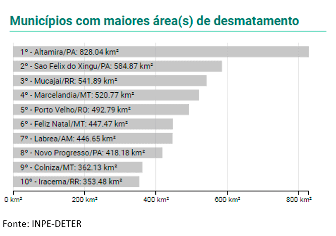 No mesmo intervalo temporal, são os municípios de agronegócio consolidado ou na rota de expansão que concentraram o montante do desmatamento. É o caso de Altamira e São Félix do Xingu no Pará e de outros municípios em outros estados amazônicos. Grosso modo também são nesses municípios ou em suas proximidades que se encontram as áreas de preservação ambiental mais atacadas pelos grileiros de terras que as invadem tocando fogo e/ou retirando suas madeiras. Floresta Nacional do Jamanxi-PA, Floresta Nacional de Roraima e Floresta Nacional de Altamira-PA são as de maior concentração do desmatamento.