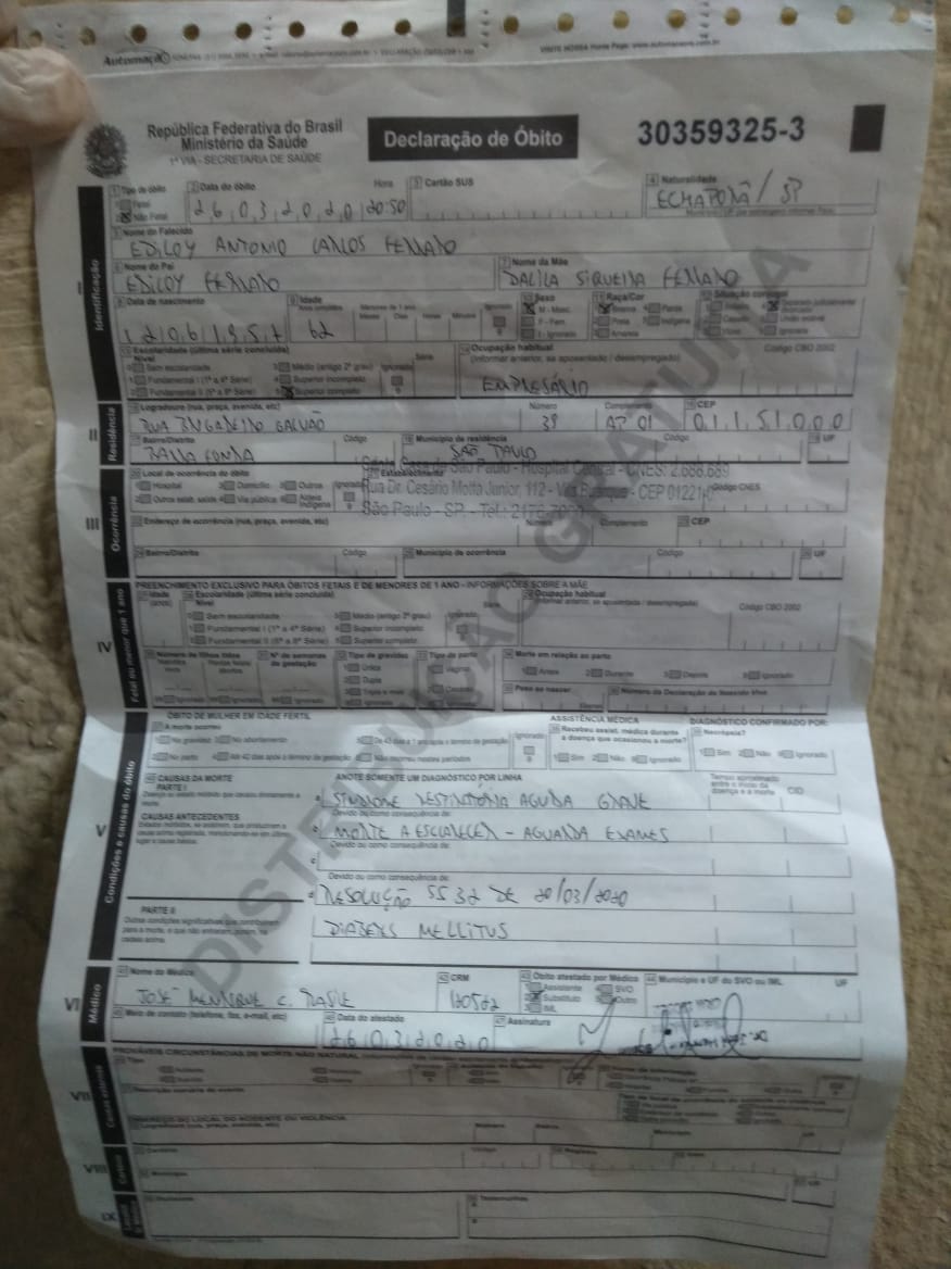 Depois do reconhecimento do corpo, tivemos problemas burocráticos na funerária, porque não aceitaram a declaração de óbito enviada pelo hospital sem constar suspeita de coronavírus. Disseram que tinha uma infinidade de casos como o nosso. Retornamos ao hospital para falar com o médico e, depois de muita discussão entre ele e a agente funerária, foi aceito acrescentar outro dado como causa básica: Resolução SS-32 de 20/03/2020, que trata como possível suspeito de coronavírus os óbitos em meio à pandemia. Aí perguntei a ele se realmente haviam feito o teste e ele confirmou, mas me avisou que a análise está demorando cerca de 10 dias e é apenas realizada pelo Instituto Adolpho Lutz. Quando sair o resultado irão notificar o governo, para controle posterior das mortes que ocorrerem na pandemia. Enquanto isso, a orientação oficial é que ele pode ter ido a óbito por qualquer outra infecção não detectada.