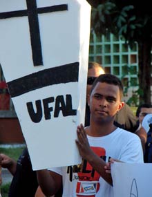 Ato convocado pelo DCE da UFAL denunciou a falta de professores, salas e laboratóriosNa tarde desta quinta-feira, 16, cerca de 90 estudantes protestaram contra a expansão irresponsável que o ReUni vem implementando na Universidade Federal de Alagoas (UFAL). A manifestação, convocada pelo Diretório Central de Estudantes (DCE), gestão Amanhã Vai Ser Outro Dia, e por centros acadêmicos, responsabilizou o governo Lula e a reitoria pelo sucateamento do ensino que vem sofrendo a UFAL.