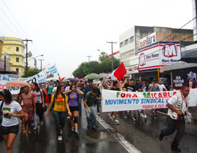 “Fora Micarla! Fora Paulinho! Arruma a mala e vai saindo de fininho!”. Essa foi uma das palavras de ordem mais cantadas pelos cerca de 300 estudantes que protestaram nas ruas de Natal na manhã desta terça-feira, dia 7. Nem mesmo a forte chuva impediu os manifestantes de realizar a terceira passeata exigindo o impeachment da prefeita Micarla de Sousa (PV) e de seu vice, Paulinho Freire. Nos últimos dias, sem ter a chuva para atrapalhar, as duas primeiras manifestações do movimento “Fora Micarla!” reuniram uma média de 2500 pessoas, entre trabalhadores e estudantes.