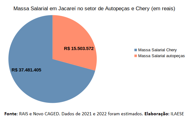 Apenas em Jacareí essa massa salarial associada diretamente a Chery e ao setor de autopeças é de R$ 53 milhões de reais anuais (gráfico abaixo), podendo abarcar outros R$ 45 milhões de reais nas demais cidades da região que atuam como fornecedores da Chery.