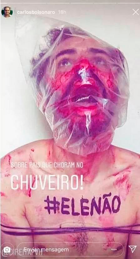 Simplesmente repugnante. Falta adjetivo para expressar o feito revoltante de Carlos Bolsonaro (PSC), o vereador filho de Jair Bolsonaro (PSL), na noite desta terça-feira, 25. O político postou em sua conta no instagram a imagem de um homem sendo torturado, sufocado por um saco plástico e com o rosto ensanguentado. Sobre a imagem a hashtag usada no movimento protagonizado por mulheres contra Bolsonaro: “#elenão”. Bolsonaro filho publicou a imagem fazendo troça: “sobre pais que choram no chuveiro”, conhecida expressão das redes sociais que faz referência a LGBT’s.