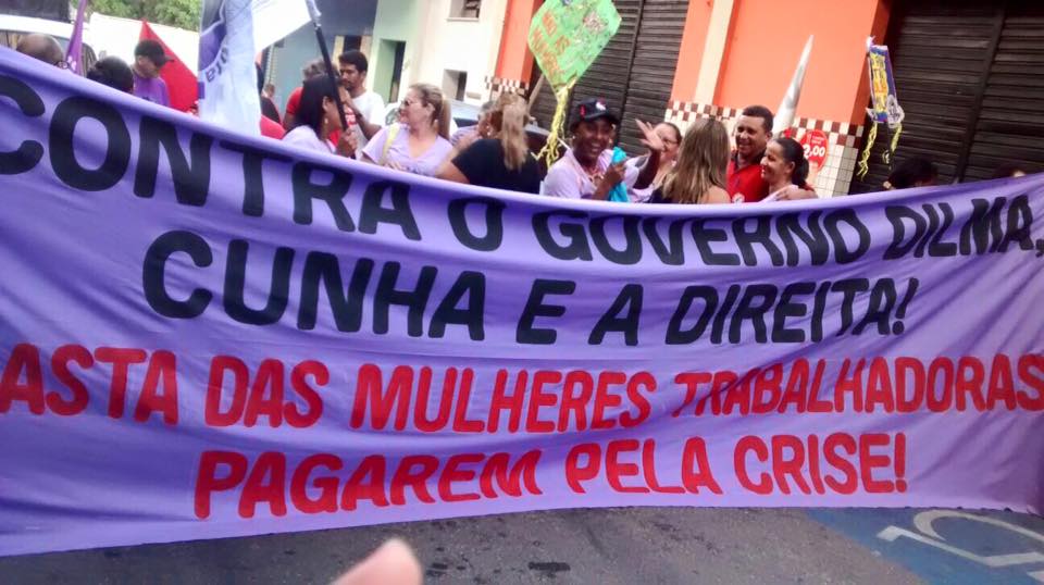 Paula Farias falou em nome da Secretaria de Mulheres do PSTU e destacou: “nós não estamos nas ruas para defender o Lula ou a Dilma, e menos ainda Aécio, Temer, Cunha ou Renan, eles brigam de vez em quando, mas estão juntos atacando as trabalhadoras. Nosso compromisso é tomar as ruas contra todos eles e para derrotar os ataques”.