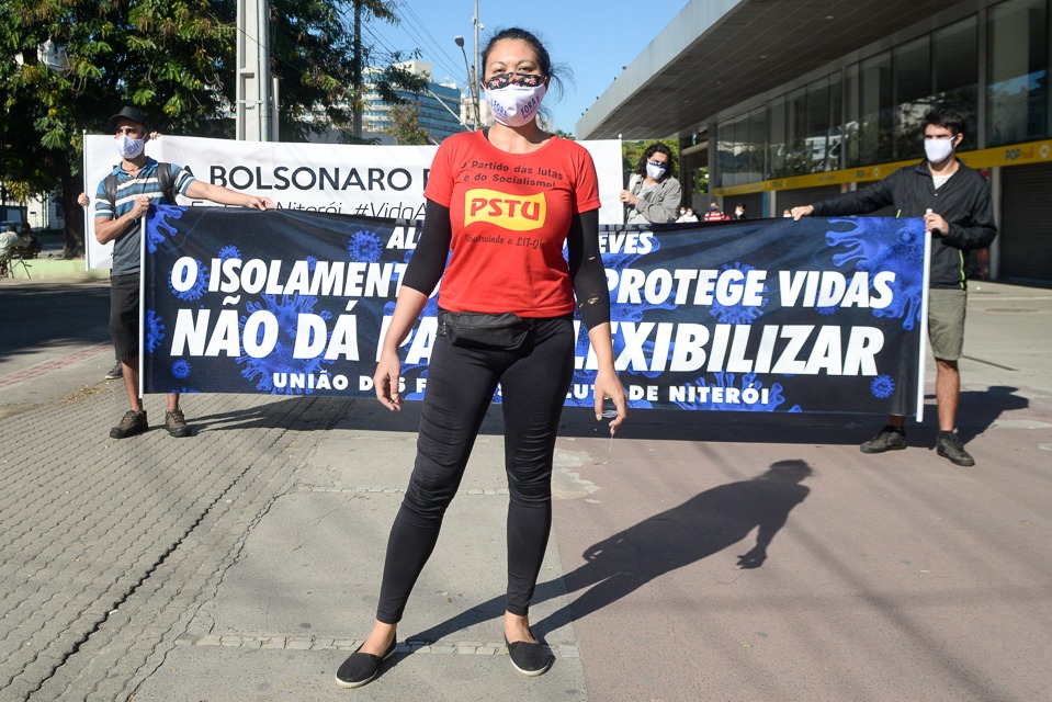 Na última quinta-feira (27/05), desde as 8 horas da manhã, reuniram-se na praça Araribóia cerca de dez ativistas de diferentes categorias. Foram estendidas faixas contra a flexibilização do isolamento social e distribuídas máscaras de “Fora Bolsonaro e Mourão”. A manifestação ocorreu com distanciamento social e sem aglomeração. A atividade foi organizada pela União dos Fóruns de Luta de Niterói, que reúne o Fórum Sindical e Popular, Fórum dos Trabalhadores da Saúde e Fórum de Luta por Moradia da cidade.