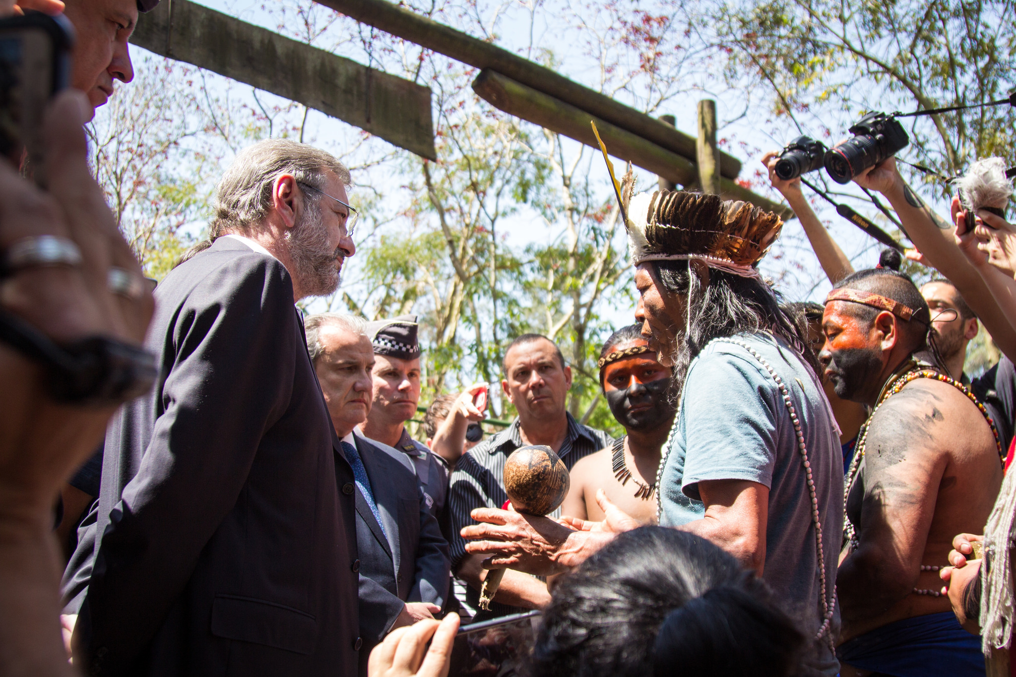 Márcio Rosa chegou acompanhado de um representante da Secretaria de Meio Ambiente, por um militar do exércio e por alguns policiais. Cantando e dançando, mas com arcos e tacapes em mãos, os guaranis cercaram a pequena delegação para que a negociação começasse.