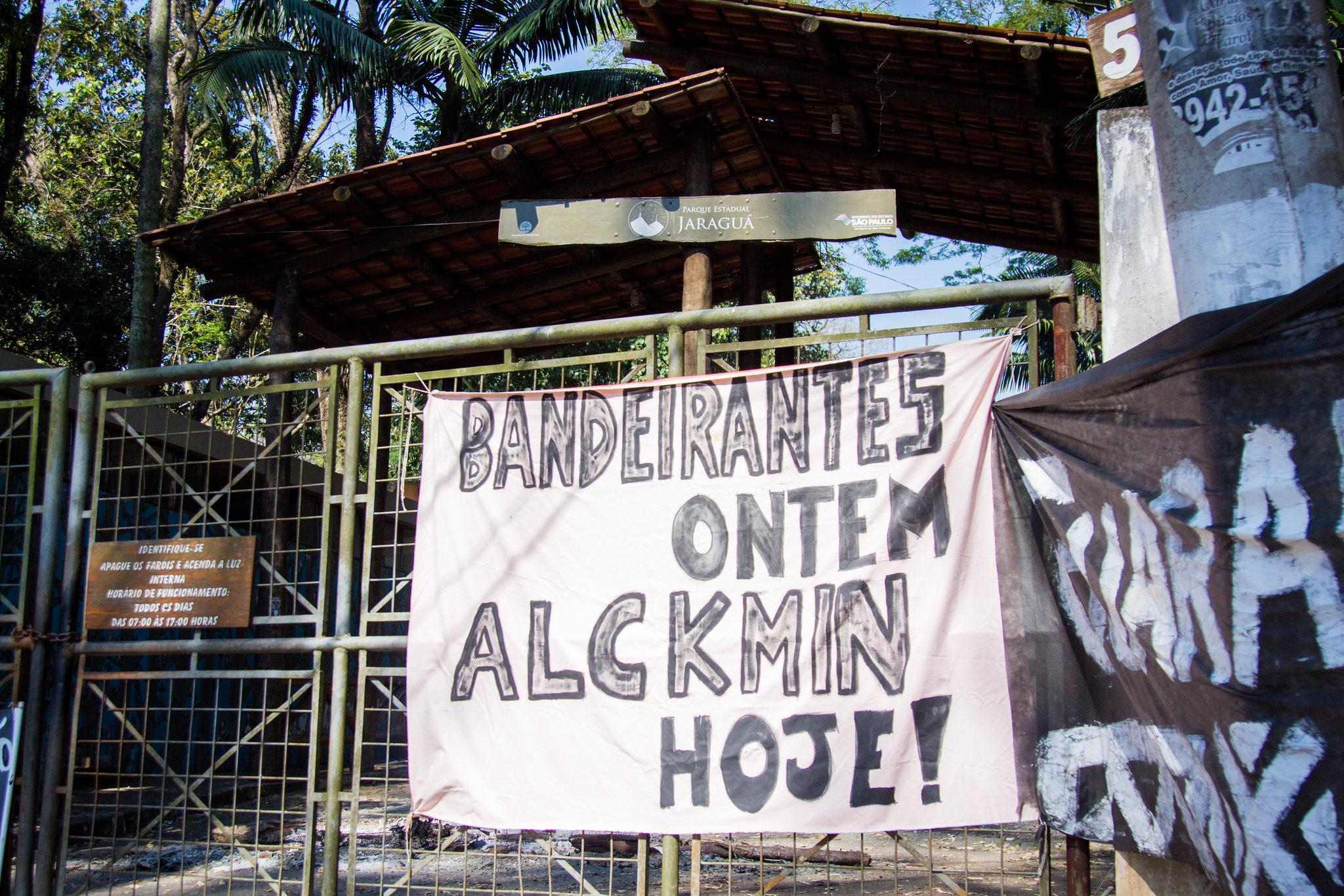 O clima era de apreensão na entrada do Parque Estadual do Jaraguá. Em uma das entradas, uma fogueira feita durante a noite servia de barricada no portão. Na grade, uma faixa dizia: “Bandeirantes ontem, Alckmin hoje“.