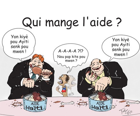 Na charge acima, retirada de um artigo publicado em um dos principais jornais haitianos (Le Nouvelliste), com o título “Quem come a ajuda?”, um mirrado haitiano aparece no meio de dois enormes e bem vestidos estrangeiros brancos. O haitiano olha de um lado para o outro se perguntando: “Não vai sobrar nada pra mim?” enquanto os dois brancos se deliciam comendo a “ajuda” que é enviada ao Haiti: “uma colher pro Haiti, cinco colheres pra mim”, dizem eles.