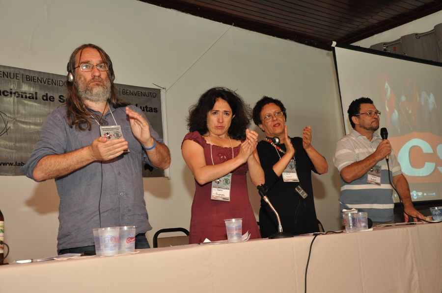 A reunião começou seus trabalhos com a apresentação da declaração internacional da Rede, onde se afirma que a crise do capitalismo mundial que vem se aprofundando desde 2008 e apresenta alguns elementos novos desde a última reunião, realizada em 2012. Dois elementos novos surgiram: a chegada da crise econômica nos países desenvolvidos, especialmente na Europa, com o consequente desmonte do Estado de bem-estar social – ataques aos direitos dos trabalhadores, às pensões e aos subsídios para o emprego. Essa é a resposta que o capitalismo dá a essa crise, baseada num reordenamento das formas de exploração do trabalho – terceirização, precarização e privatização são alguns aspectos desse reordenamento. O segundo elemento é um importante rompimento com as burocracias sindicais e com os partidos reformistas e frente-populistas – a ruptura da classe trabalhadora com o PT é um exemplo disso -, com uma dinâmica mais rápida dos processos de reorganização sindical e política das organizações operárias.