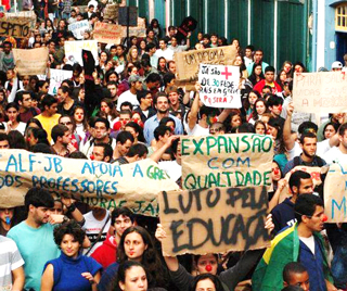 Unir estudantes, professores e funcionários contra os ataques do governo Dilma!“É ou não é piada de salão: tem dinheiro para a Copa, mas não tem pra Educação?”. Esse era um dos vários cartazes carregados pelos estudantes que se manifestaram pelas ruas de Ouro Preto (MG), em defesa da Educação. Essa grande manifestação foi uma das expressões do apoio à greve dos professores das Instituições Federais de Ensino, que começa a sacudir o país. É uma greve histórica, que começou dia 17 de maio com muita força. Entre 59 universidades e institutos ligados ao Governo Federal, já são 46 os que aderiram à greve nacional. Além dos docentes, os funcionários já apresentam um indicativo de greve para o dia 11 de junho. Os estudantes já votaram apoio à luta dos professores em diversas universidades, além de greve estudantil em 18 delas. Estes são dados de quando fechávamos esse texto, dia 24 de maio, mas os números não paravam de crescer.