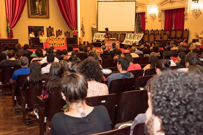 O salão nobre da Faculdade de Direito da USP do Largo São Francisco foi palco de importante evento sobre a luta pela moradia em São Paulo. Realizado na última quinta-feira, 21, o debate “Remoções ilegais e o problema social da moradia: o caso da Ocupação dos Queixadas”, promovido pelo movimento Luta Popular (filiada à CSP-Conlutas), debateu a ilegalidade e a total arbitrariedade da operação policial de remoção dos moradores da ocupação Queixadas.