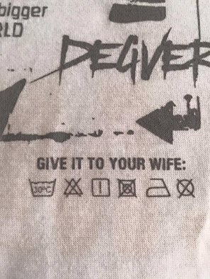 Blusa de time na recomendação de lavagem traz os dizeres “Give it to your wife” (dê para sua esposa)