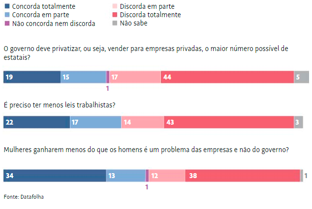 À pergunta: “o governo deve vender para empresas privadas o maior número possível de estatais”?, 44% declararam que “discordam totalmente”, e 17% que “discordam em parte”. Apenas 19% afirmaram “concordar totalmente” com a medida, e 15% “em parte”. Números parecidos com a questão dos direitos trabalhistas: 43% dizem “discordar totalmente” de que “é preciso ter menos direitos trabalhistas”, e 14% discordam “em parte”.