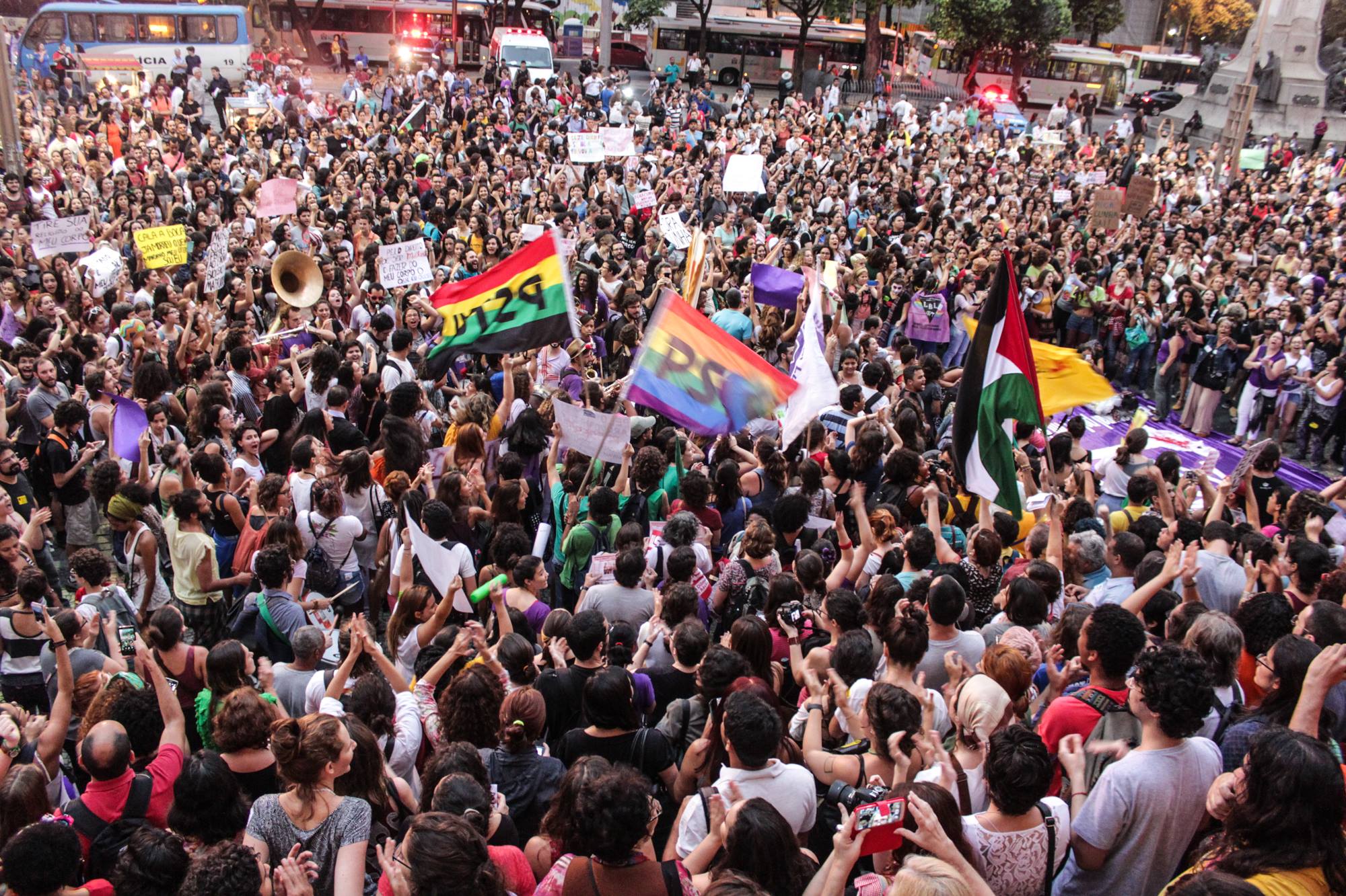 A Cinelândia, tradicional local de manifestações políticas no Rio de Janeiro, foi tomada esta quarta-feira, dia 28, por milhares de pessoas, a ampla maioria mulheres. O motivo da manifestação: um forte protesto contra o presidente da Câmara Eduardo Cunha (PMDB) e o projeto de sua autoria, o PL 5469/13, que entre outros ataques, pune a mulher vítima de estupro e pode proibir a distribuição da pílula do dia seguinte.