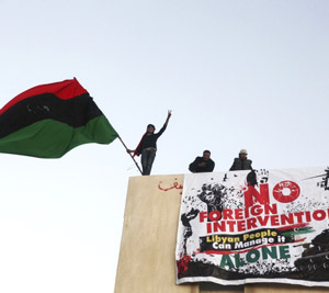 Em Bengasi, centro da oposição ao ditador e a segunda maior cidade do país, uma faixa estampava a frase na principal praça: “Não à intervenção estrangeira, o povo líbio pode gerir isso sozinho”, junto a uma manifestante com a bandeira líbia da era anterior a Kadafi. O correspondente do Estadão na região, Lourival Santana relata que “os rebeldes não querem e acham que não precisam de tropas estrangeiras; dizem que no terreno são superiores às forças leais ao regime” .