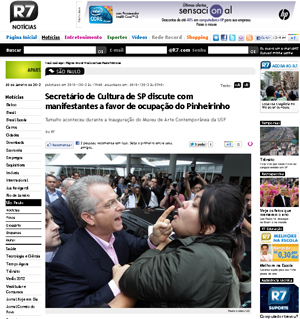 Estive na inauguração do MAC junto com Arielli Tavares que colocou o dedo na cara do Secretário de Cultura, questionando sobre o massacre do Pinheirinho. Não foi a primeira vez que isso aconteceu. Na entrega do prêmio Governador do Estado, corajosamente os cineastas Marcos Dutra e Juliana Rojas leram o manifesto Política do Coturno denunciando a crueldade e truculência do governo. O secretário respondeu dizendo que endossa a operação.