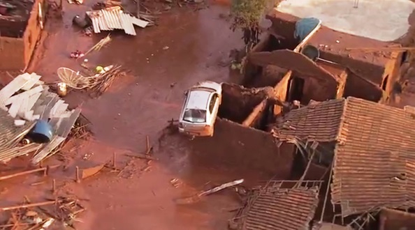 Uma barragem de rejeito, com milhares de toneladas de lama tóxica, rompeu, levando a que uma onda percorresse toda a região arrasando tudo a sua frente.