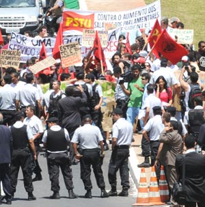 Cerca de 200 manifestantes, entre ativistas da CSP-Conlutas, ANEL, PSTU, Rede Estudantil Classista, entre outros que compõem o “Comitê contra o aumento dos Parlamentares de Brasília”, expressaram indignação frente ao aumento de 62%, que elevará os salários para quase R$ 27 mil.