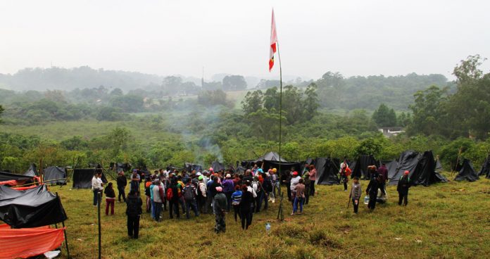 Um grande bambu é erguido no centro do terreno. Em sua ponta, a bandeira do movimento Luta Popular.