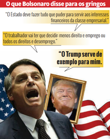 Como podemos ver, o nacionalismo e o patriotismo do deputado filhote da ditadura militar é apenas discurso. Bolsonaro foi oferecer o Brasil na bandeja, deixando explícito que o seu compromisso é com empresários, banqueiros e grandes investidores. “O Estado deve fazer tudo que puder para servir aos interesses financeiros da classe empresarial, pois o empresário tem seu sangue sugado pelo governo”, disse em discurso na terra de Trump.