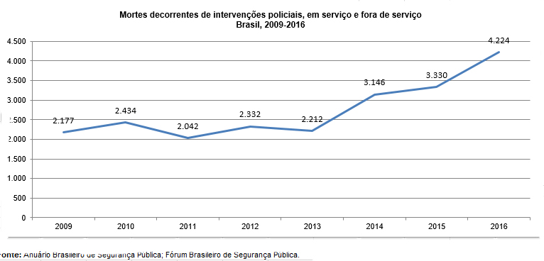 O levantamento do fórum aponta que 4.224 pessoas foram mortas em decorrência de intervenções policiais em 2016, um crescimento de 25,8% em relação a 2015 (3.330 mortes). Entre 2009 e 2016, 21.897 pessoas morreram em ações policiais. Desses, a maioria, 76%, eram negros.
