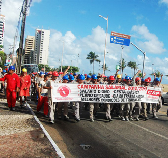 Assembleia reuniu 2 mil trabalhadores na sede do sindicato, filiado à CSP-ConlutasQualquer que seja o juízo que se queira formular, é de se reconhecer que a campanha salarial da construção civil da Região Metropolitana de Fortaleza já se constitui em uma grande vitória da categoria. Depois de cerca de 10 paralisações em distintas áreas da RMF, envolvendo mais de uma centena de canteiros de obra, a força do operariado e a sua organização são fatores que não podem ser desprezados. A cidade despertou em cada um desses dias com um semblante diferente. As ruas apinhadas de trabalhadores com a sua indumentária de trabalho e os seus rostos sofridos davam uma expressão diferente à quinta maior metrópole do país. De fato, os operários da construção civil se tornaram uma referência obrigatória da paisagem urbana.